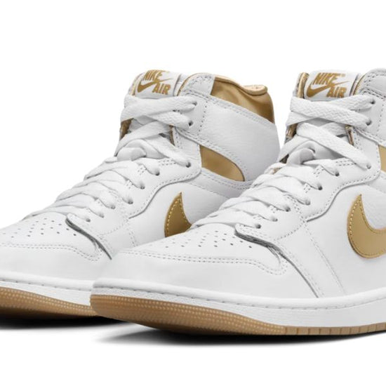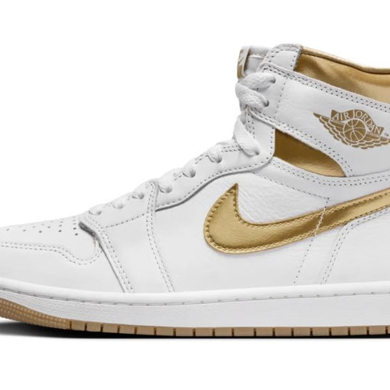 Jordan 1 High OG Metallic Gold přináší do ikonické siluety Air Jordan 1 zlaté detaily a kvalitní bílý kožený svršek. Tato retro teniska v designu vysokého střihu nabízí kožené překrytí v tonální bílé barvě a zlaté kovové akcenty na Swooshes, límci a logu Jordan Wings. Jazyk tenisky má logo s bílým podkladem a zlatým kovovým prošíváním. Perforace na špičce umožňují prodyšnost a gumová podešev v barvě světle hnědé gumy doplňuje zlaté detaily.
