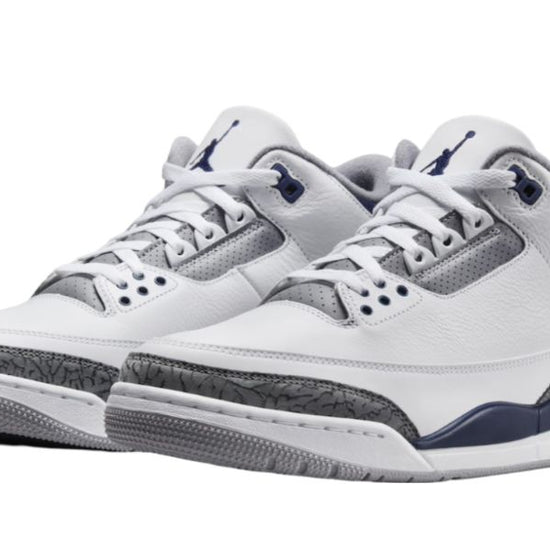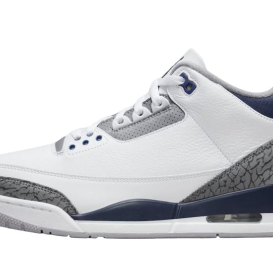 Jordan 3 Retro Midnight Navy přináší klasický styl s motivem White Cement z roku 1988. Kombinuje modrou, bílou a cementovou šedou s elefantím potiskem a modrými akcenty. Jumpman logo dodává moderní dotek.