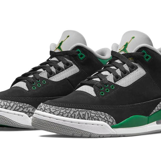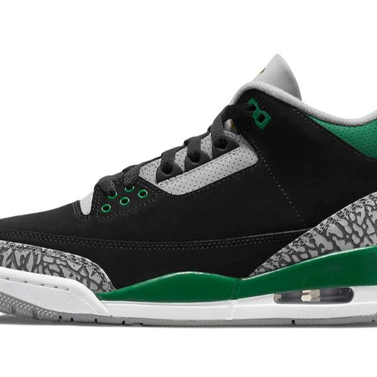 Air Jordan 3 Pine Green disponuje černým svrškem z Durabuck materiálu s charakteristickými vrstvami potisku slona a zelenými perforovanými límci. Odstíny Pine Green na mezipodešvi a výšivka Jumpman na jazyku vynikají na neutrálním pozadí.