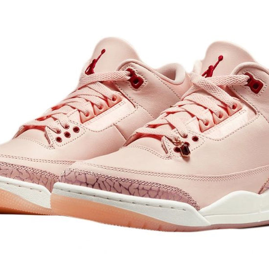 Jordan 3 Retro Valentine’s Day Treat Yourself je stylová oslava lásky ve sneaker kultuře. Má luxusní korálový kožený svršek, který zachovává klasickou siluetu Jordan 3, ale s romantickým nádechem. Ikonický elephant print na špičce a patě se třpytí v jemně růžovém odstínu, což dodává teniskám elegantní kontrast.