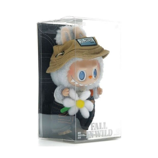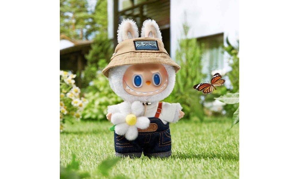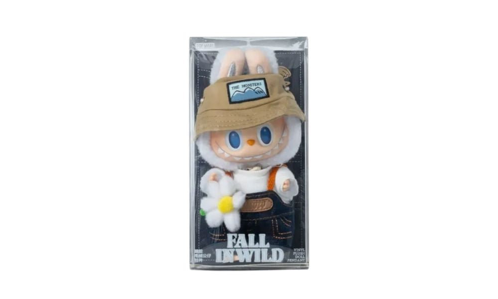 Tento přívěsek zobrazuje Labubu v bílé košili a džínových lacláčích, s měkkým sedmikráskovým detailem na levé straně a hnědým bucket kloboukem s logem The Monsters na přední straně. Vinylová tvář zdůrazňuje Labubovy modré oči a široký úsměv s ostrými zuby. Postavička je připevněna ke zlatému kroužku pomocí textilního pásku s nápisem "The Monsters." Velikost figurky je 17 cm.